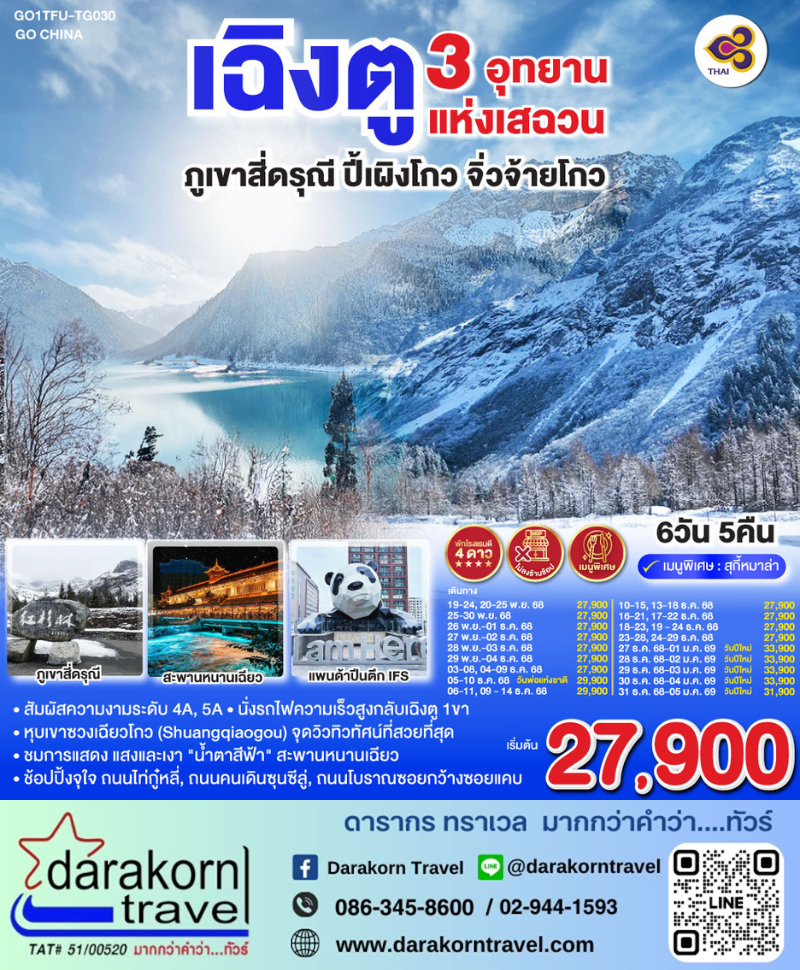 DAY1 | กรุงเทพฯ(สนามบินสุวรรณภูมิ) (TG618: 10.55-15.05) – เมืองเฉิงตู – เมืองตูเจียงเอี้ยน – สะพานหนานเฉียว – ชมแสงสียามค่ำคืน Blue Tears |