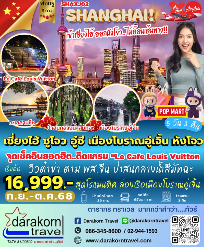 DAY2 | สนามบินดอนเมือง >> XJ760 : DMK-PVG [00.05-05.50] << – มหานครเซี่ยงไฮ้ – ตลาดเฉินหวังเมี่ยว – หาดไหว่ทาน (หาดเจ้าพ่อเซี่ยงไฮ้) – ถนนนานกิง พาช้อป POP MART – ชมหยกโบราณ- ห้างซิงเย่วไท่กู่ฮุ่ย – ตึกสตาร์บัค – ตึกเรือสำราญ หลุยส์วิคตอง Le Café Louis Vuitton *จุดเช็คอินใหม่ของ พ.ส. จีน* |