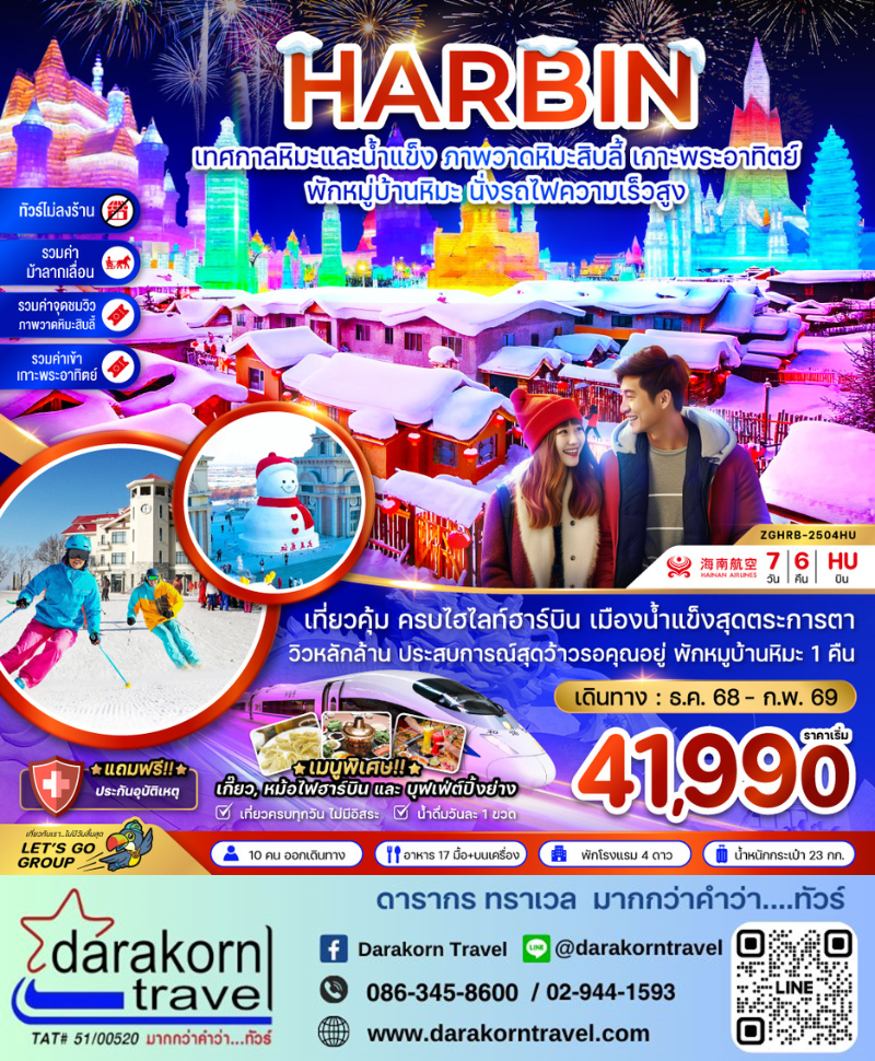 | DAY2 | นั่งรถไฟความเร็วสูง ต้าเหลียน-ฮาร์บิน – เมืองฮาร์บิน – ร้านเครื่องกันหนาว – มนุษย์หิมะยักษ์ – เมืองฮาร์บิน – เทศกาล แกะสลักน้ำแข็ง |