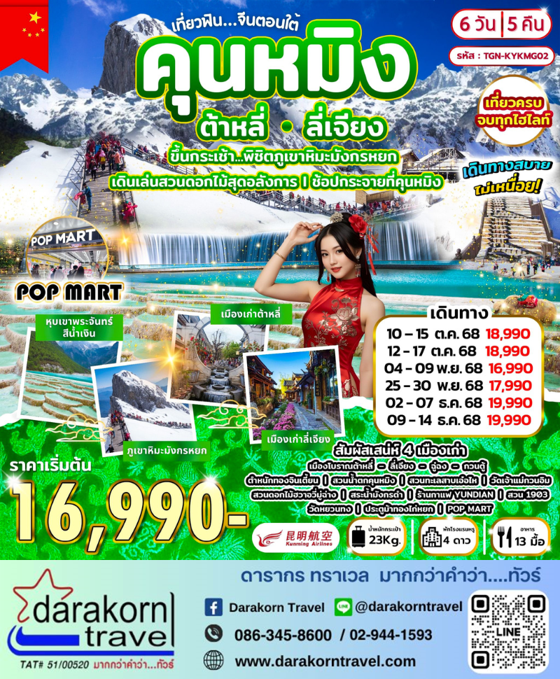 DAY3 | วัดเจ้าแม่กวนอิม • เมืองโบราณต้าหลี่ • ผ่านชมเจดีย์สามองค์แห่งวัดฉงเซิ่น • สวนดอกไม้ฮวาอวี่มู่ฉ่าง • เมืองลี่เจียง • สระน้ำมังกรดำ • เมืองโบราณลี่เจียง |