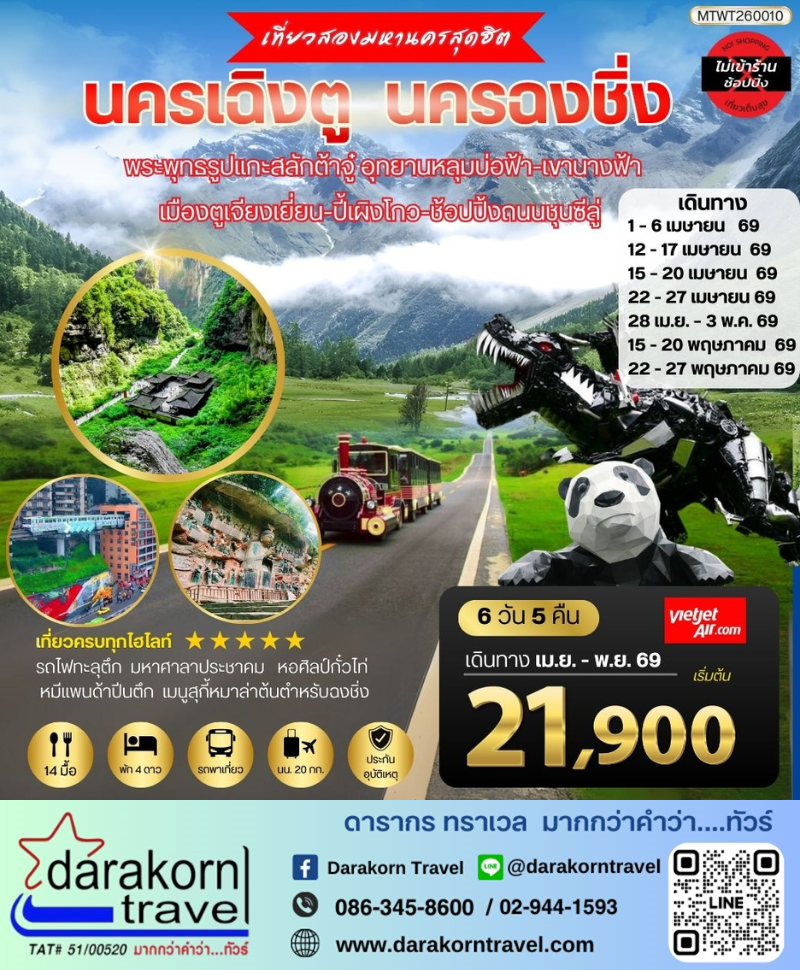 | DAY6 | เมืองเฉิงตู- ถนนไท่กู่หลี่–วัดต้าฉือ-ตึก IFS แพนด้าปีนตึก-ถนนชุนซีลู่ -บินกลับกรุงเทพ |
