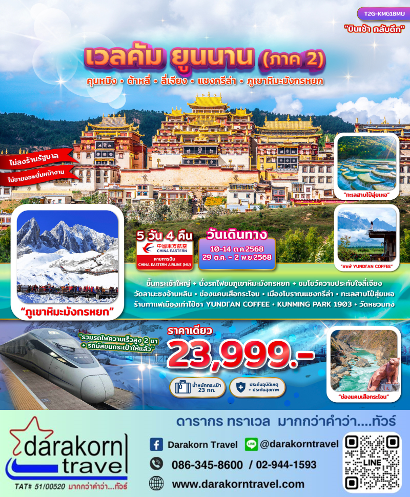 DAY5 | ลี่เจียง – นั่งรถไฟความเร็วสูง C452 (07.57-12.04) – คุนหมิง – KUNMING PARK 1903 – ประตูม้าทองไก่หยก – สนามบินคุนหมิง KMG-BKK MU9621 (20.40-22.15) – สนามบินสุวรรณภูมิ |