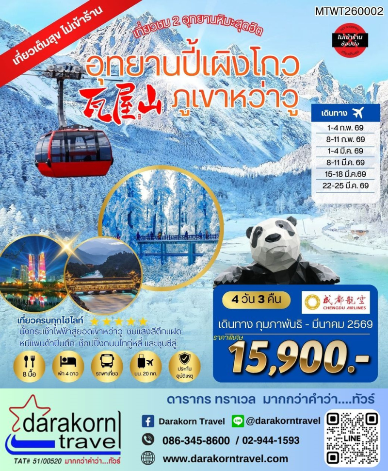 | DAY4 | เมืองเฉิงตู- ถนนไท่กู่หลี่–วัดต้าฉือ–หมีแพนด้าปีนตึก-อิสระ ช้อปปิ้ง ณ ถนนชุนซีลู่ – บินกลับกรุงเทพฯ |
