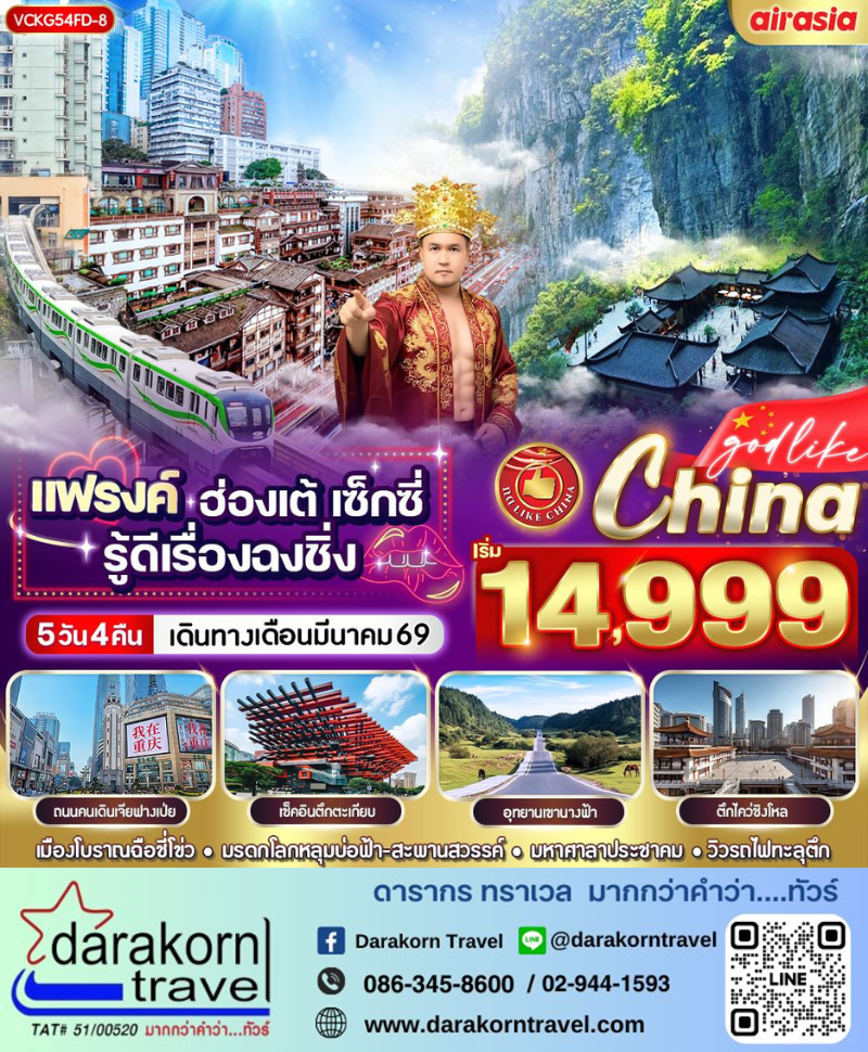 | DAY1 | สนามบินดอนเมือง – สนามบิน ฉงชิ่ง เจียงเป่ย – หมู่บ้านโบราณฉือชี่โข่ว – อู่หลง |