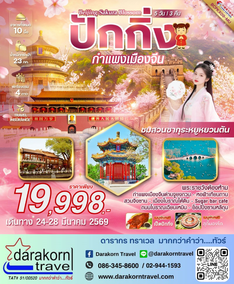 | DAY4 | ร้านยางพารา – กำแพงเมืองจีนด่านจวียงกวน – สวนหยูหยวนตัน(ชมซากุระ) –ร้านยา –ย่านศูนย์การค้า Solana |