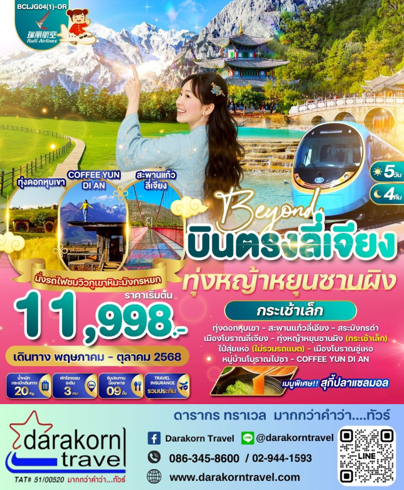ทัวร์จีน - Beyond บินตรงลี่เจียง ทุ่งหญ้าหยุนซานผิง(กระเช้าเล็ก) 5วัน4คืน(DR)เดือนสิงหาคม - ตุลาคม 2568
