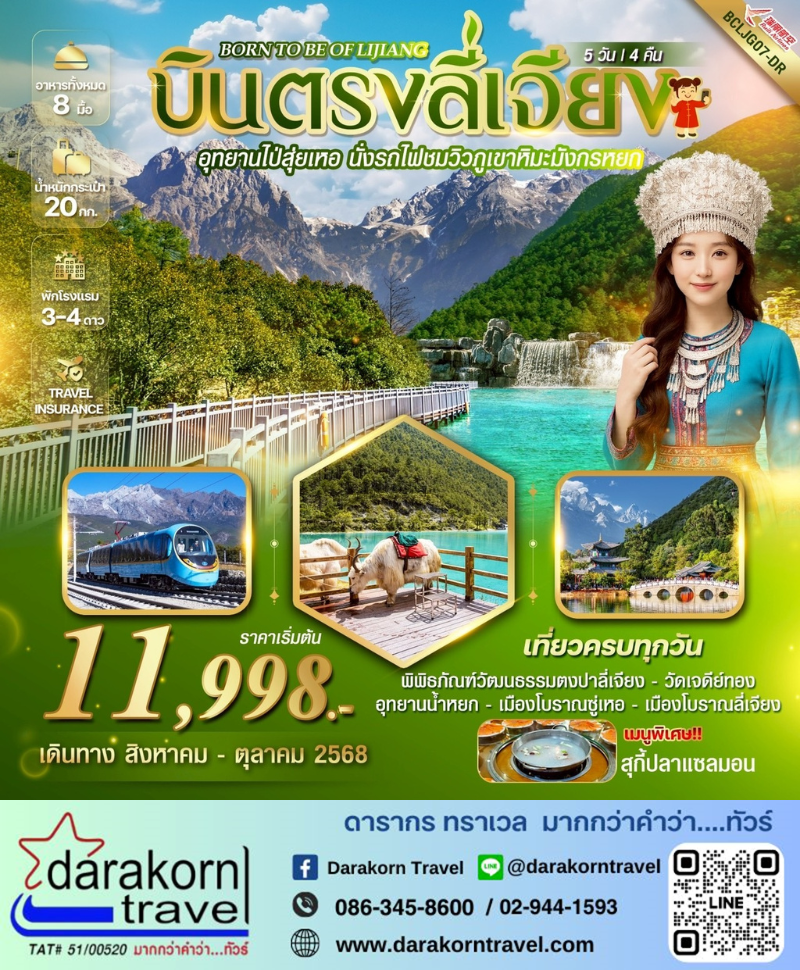 ทัวร์จีน - Born To Be Of Lijiang บินตรงลี่เจียง อุทยานไป๋สุ่ยเหอ 5วัน4คืน(DR)เดือนกันยายน - ตุลาคม 2568