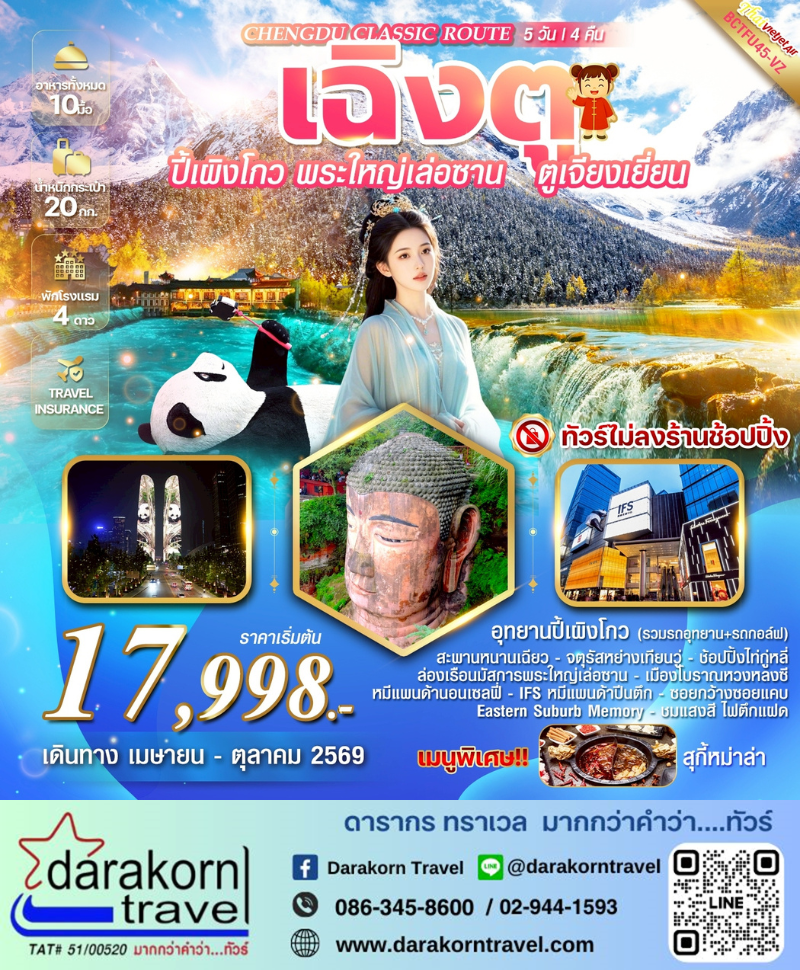 | DAY5 | ซอยกว้างซอยแคบ – วัดต้าฉือ – ถนนคนเดินไท๋กูหลี่ – ถนนคนเดินชุนซีลู่ – แพนด้ายักษ์ปีนตึก IFS – POP MART ท่าอากาศยานเฉิงตูเทียนฟู่ – กรุงเทพฯสุวรรณภูมิ VZ3681(23.50-01.15+1) |