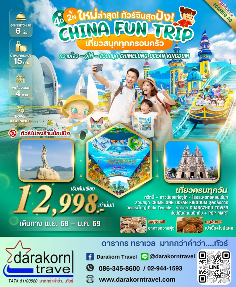 | DAY2 | สนามบินกวางโจวไป๋ หยุน AQ1266 (02:30 – 06:10) – วัดพระใหญ่ – ถนนปักกิ่ง – จัตุระสฮัวเฉิง – ถ่ายรูปตึกกวางโจว(ด้านนอก) – นั่งรถสู่จู่ไห่ – ถนนคนเดินฝุ่นฮัวหลี |