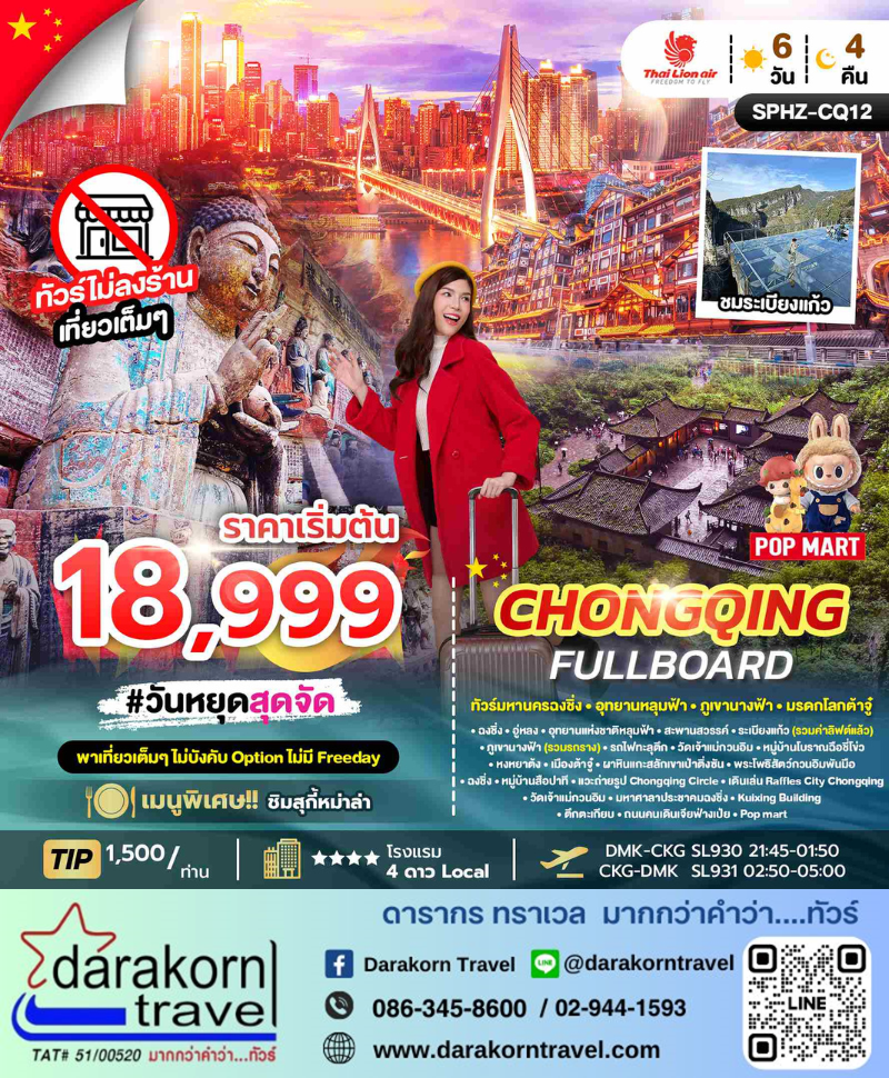 | DAY1 | กรุงเทพฯ (สนามบินดอนเมือง)(DMK-CKG SL930 21:45-01:50) |