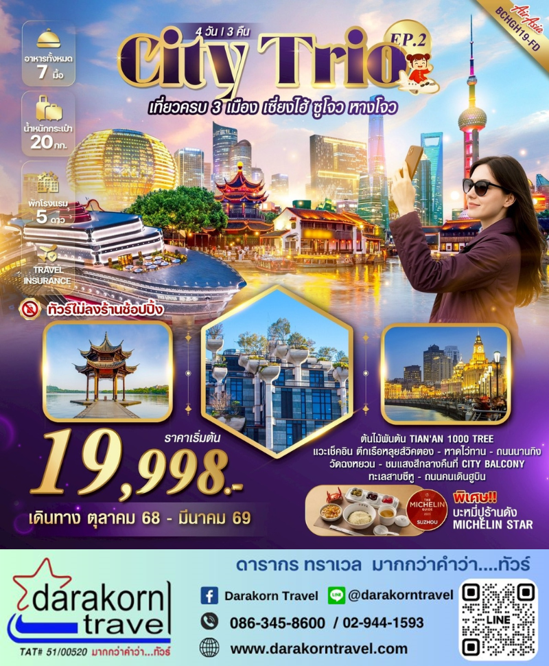 DAY4 | GRAND CANAI MUSEUM – สะพานกงเชิน (Gongchen Bridge)-หมู่บ้านวัฒนธรรม XIAOHE STREET HISTORIC DISTRICT-ถนนคนเดินฮูบิน – ทะเลสาบซีหู (ไม่รวมค่าล่องเรือ)สนามบินหางโจว – ดอนเมือง FD497 (18.10-21.15) |