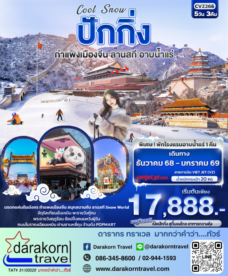 | DAY3 | ร้านบัวหิมะ – กำแพงเมืองจีน (ด่านจวียงกวน) – ลานสกี Snow World (รวมค่าเข้าลานสกีแต่ไม่รวมเครื่องเล่นสกีทุกชนิด) – ผ่านชมสนามกีฬารังนก – เข้าสู่ที่พักโรงแรมอาบน้ำแร่ |