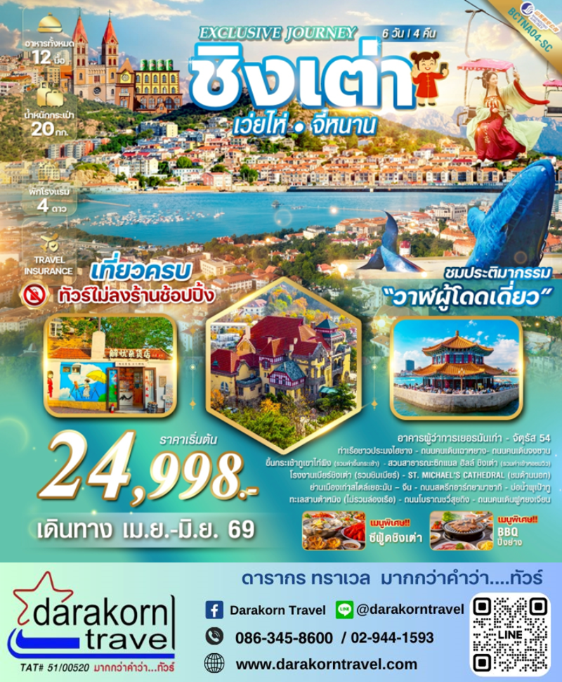 | ทัวร์จีน – Exclusive Journey Qingdao เมืองชิงเต่า เว่ยไห่ จี่หนาน ประติมากรรม“วาฬผู้โดดเดี่ยว 6วัน4คืน(SC)เดือนเมษายน – มิถุนายน 2569 |