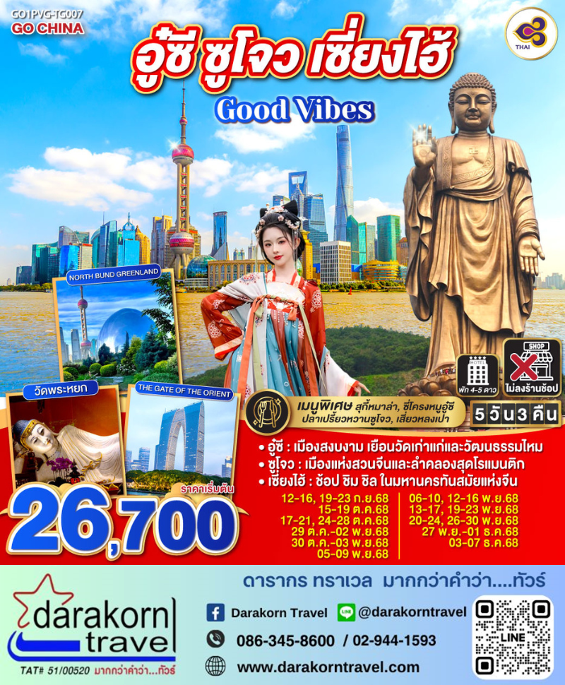DAY5 | วัดพระหยก – FLORENTIA VILLAGE OUTLET – สนามบินเซี่ยงไฮ้ – กรุงเทพฯ(สนามบินสุวรรณภูมิ) (TG665 : 17.25-21.00) |