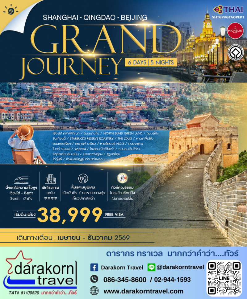 ทัวร์จีน - Grand Journey เซี่ยงไฮ้ ชิงเต่า ปักกิ่ง 6วัน5คืน(TG)เดือนเมษายน - ธันวาคม 2569