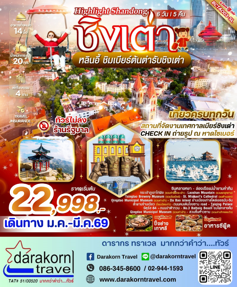 | DAY2 | หลินหยี – ชิงเต่า – กระเช้าภูเขาไท่ผิง (รวมค่าขึ้นกระเช้า) – St. Michael’s Cathedral (ชมด้านนอก) – Da Bao island ย่านเมืองเก่าสไตล์เยอะมัน-จีนสะพานจ้านเฉียว(โซนเมืองเก่า) – ถนนคนเดินจงซาน |