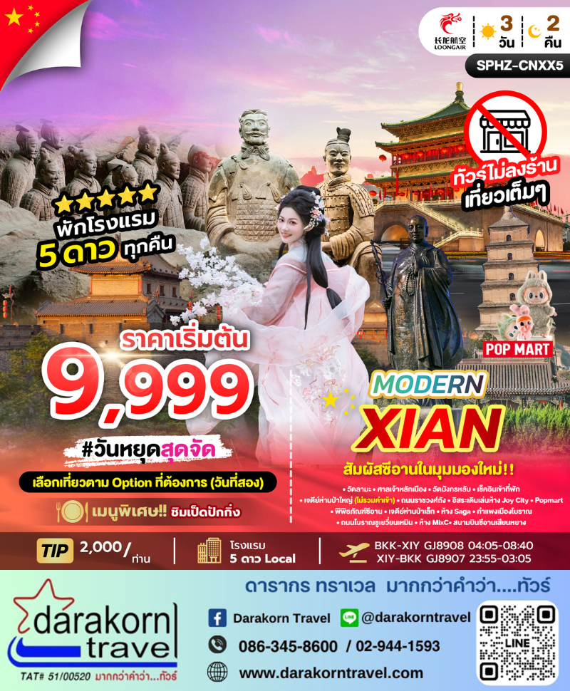 | DAY1 | กรุงเทพฯ(สนามบินสุวรรณภูมิ)-สนามบินซีอานเสียนหยาง-วัดลามะ-ศาลเจ้าหลักเมือง-วัดมังกรหลับ-เช็คอินเข้าที่พัก-เจดีย์ห่านป่าใหญ่ (ไม่รวมค่าเข้า)-ถนนราชวงศ์ถัง-อิสระเดินเล่นห้าง Joy City- Popmart |