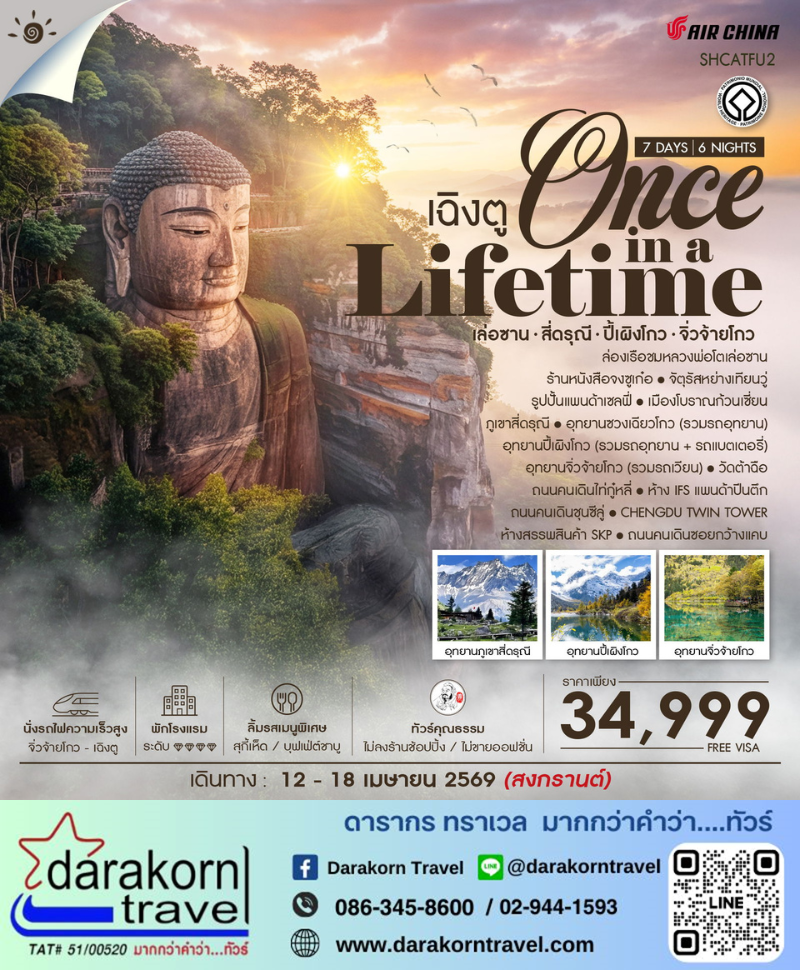 ทัวร์จีน - เฉิงตู ต๋ากู่ปิงชวน สี่ดรุณี จิ่วจ้ายโกว“มหัศจรรย์เสฉวนเหนือ 7วัน6คืน(CA)เดือนเมษายน 2569