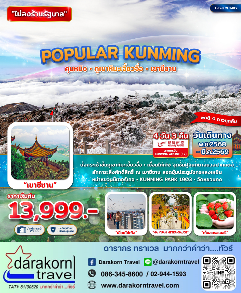 | DAY1 | สนามบินสุวรรณภูมิ BKK-KMG KY8368 (20.35-23.40) สนามบินเมืองคุนหมิง – เข้าโรงแรม |