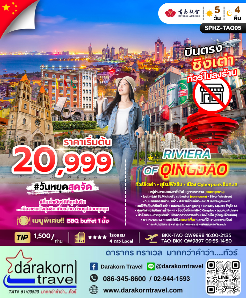 | DAY1 | กรุงเทพฯ(สนามบินสุวรรณภูมิ)–สนามบินชิงเต่าเจียวตง-รถโค้ชนำท่านสู่โรงแรม(BKK-TAO QW9898 16:00-21:35) |