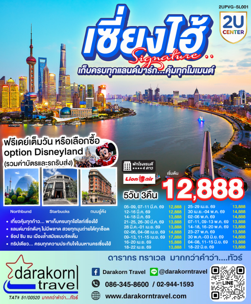 | DAY1 | กรุงเทพฯ (สนามบินดอนเมือง) – สนามบินซางไฮ้ผู่ตง มหานครเซี่ยงไฮ้ (SL926 : 20.20-01.30+1) |