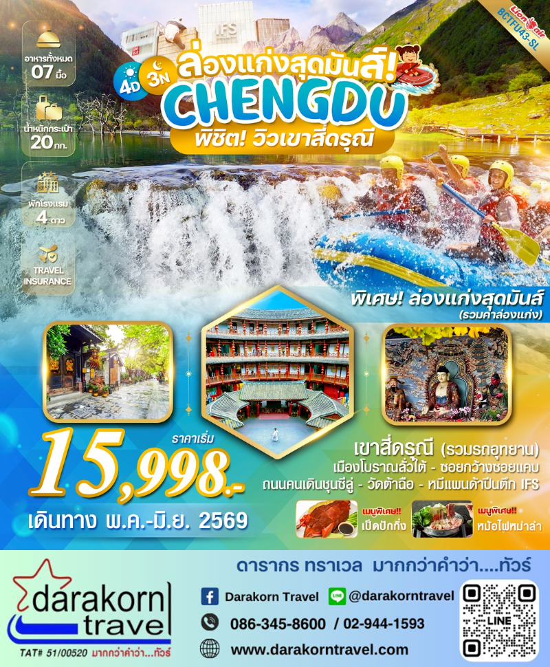 | DAY2 | เฉิงตู – เดินทางสู่สี่ดรุณี – ภูเขาสี่ดรุณี หุบเขาชวงเฉียวโกว(รวมรถอุทยาน) – ล่องเรือยาง เหนียนอวี่ป้า (Nian Yu Ba) (รวมค่าล่องเรือ) – ตูเจียงเอี้ยน |