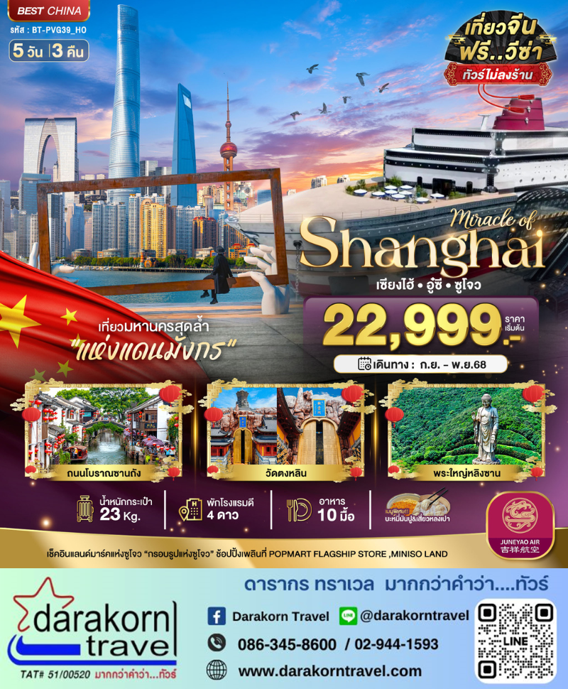 ทัวร์จีน - มหัศจรรย์...เซี่ยงไฮ้ อู๋ซี ซูโจว 5วัน3คืน(HO)เดือนกันยายน - พฤศจิกายน 2568