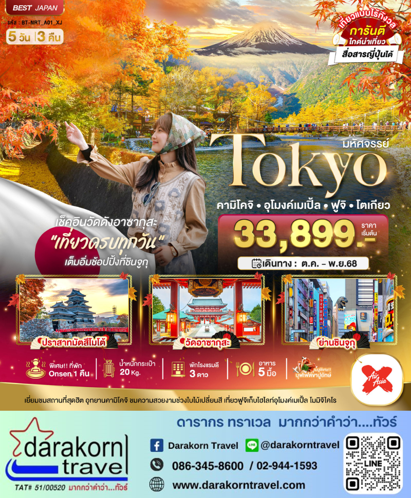 ทัวร์ญี่ปุ่น - มหัศจรรย์...โตเกียว คามิโคจิ อุโมงค์เมเปิ้ล ฟูจิ โตเกียว 5วัน3คืน(XJ)เดือนตุลาคม - พฤศจิกายน 2568
