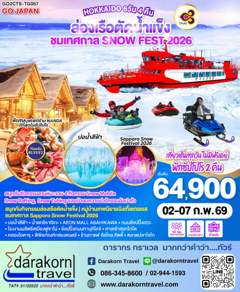 | DAY4 | กิจกรรมลานหิมะ(รวม 4 กิจกรรม Snow Mobile, Snow Rafting, Snow Tubing และเข้าชมความน่ารักของอัลปาก้า) – โรงงานผลิตชีสเมืองฟูราโน่ – เมืองซัปโปโร – ช้อปปิ้งถนนทานุกิโคจิ – ชมเทศกาล Sapporo Snow Festival 2026 |