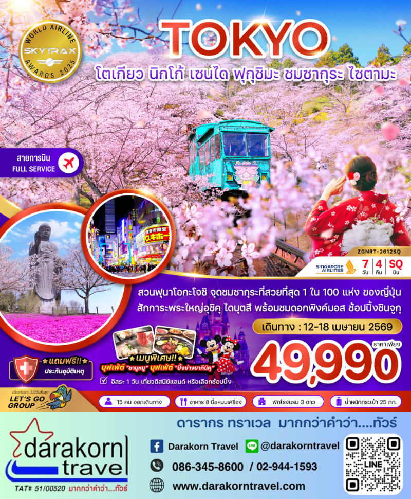 ทัวร์ญี่ปุ่น - โตเกียว นิกโก้ เซนได ฟุกุชิมะ ชมซากุระ ไซตามะ 7วัน4คืน(SQ)เดือนเมษายน 2569