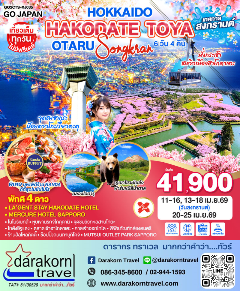 | DAY3 | จุดชมวิวทะเลสาบโทยะ – เมืองฮาโกดาเตะ – ป้อมดาวโกะเรียวคะคุ (รวมค่าขึ้นหอคอย) – โกดังอิฐแดง – นั่งกระเช้าชมวิวเมืองฮาโกดาเตะ (รวมค่ากระเช้า) – แช่น้ำแร่ธรรมชาติ |