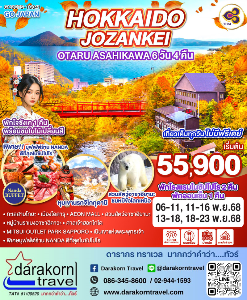DAY1 | กรุงเทพฯ (สนามบินสุวรรณภูมิ) – ซัปโปโร (สนามบินชิโตเสะ) (TG670 : 23.45-08.30) |