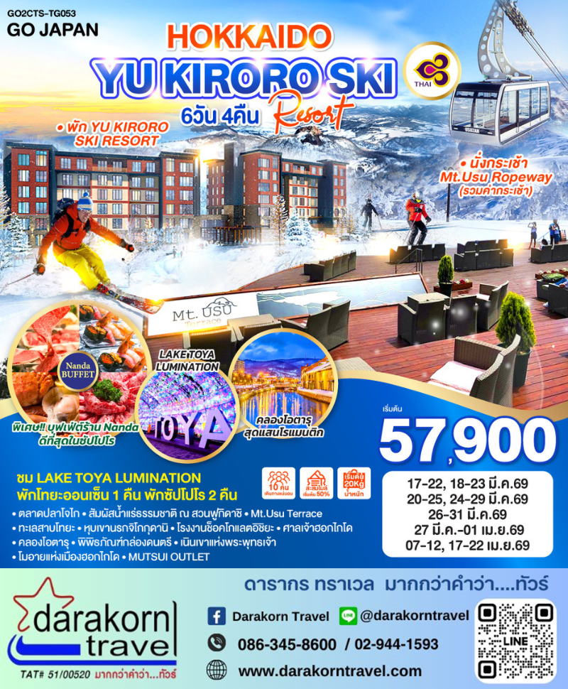 | DAY2 | ซัปโปโร (สนามบินชิโตเซะ) – ตลาดปลาโจไก – อิสระ ลานสกี KIRORO SNOW WORLD – ลั่นระฆังแห่งความรัก (ไม่รวมค่ากระเช้า) – YU KIRORO SKI RESORT – แช่น้ำแร่ธรรมชาติ |