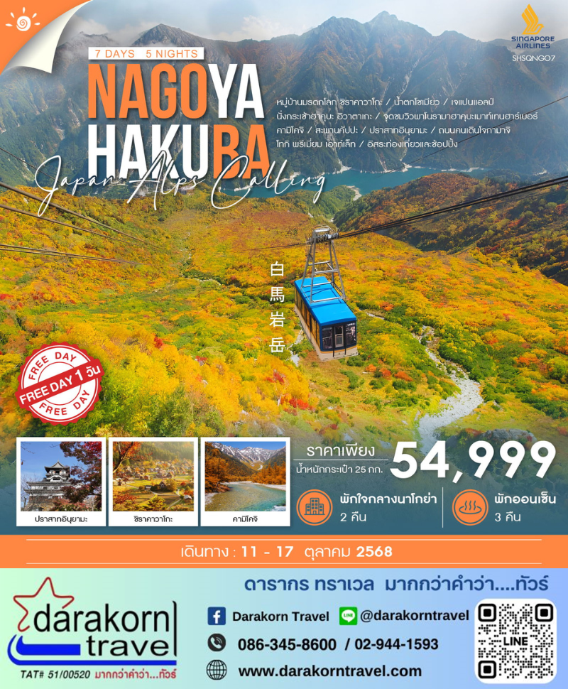 ทัวร์ญี่ปุ่น - NAGOYA HAKUBA JAPAN ALPS ฟรีเดย์ 7วัน5คืน(SQ)เดือนตุลาคม 2568