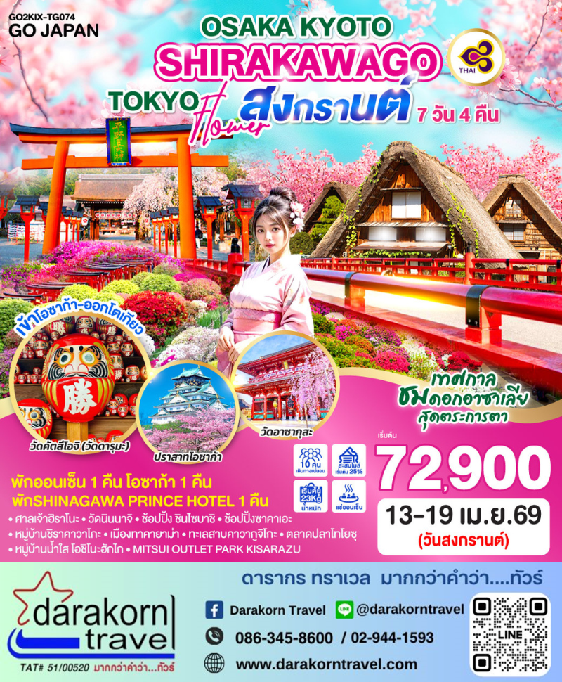 | DAY1 | กรุงเทพฯ (สนามบินสุวรรณภูมิ) – โอซาก้า (สนามบินคันไซ) (TG622 : 23.59-07.20) |