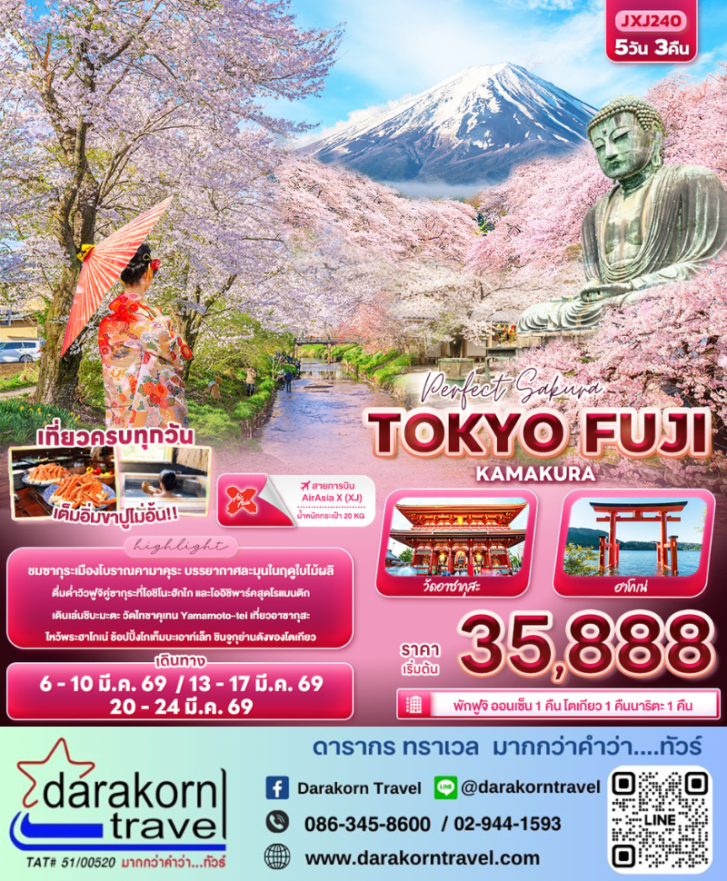 | DAY3 | โตเกียว – จังหวัดคานางาวะ – พระใหญ่ไดบุตสึ – ตลาดปลา – เมืองฮาโกเน่ – ศาลเจ้าฮาโกเน่ – โกเทมบะ เอ้าท์เล็ต – จังหวัดยามานาชิ – พักฟูจิออนเซ็น |