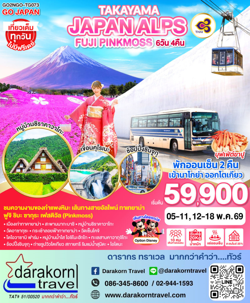 | DAY2 | นาโกย่า (สนามบินชูบุเซ็นแทร์) – เมืองทาคายาม่า – เมืองเก่าทาคายาม่า – สะพานนากะบาชิ – หมู่บ้านชิราคาวาโกะ – แช่น้ำแร่ธรรมชาติ |