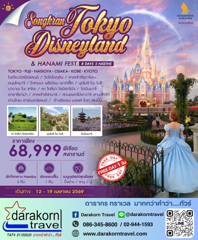 | DAY1 | กรุงเทพฯ (สนามบินสุวรรณภูมิ) • สิงคโปร์ (SQ711:18.30-21.55) • สิงคโปร์ • โตเกียว (สนามบินนาริตะ) (SQ638:23.55-08.00) |