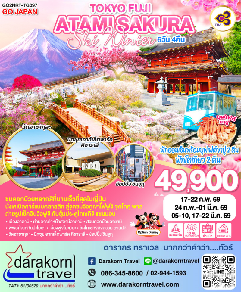 ทัวร์ญี่ปุ่น - TOKYO FUJI ATAMI SAKURA SKI WINTER 6วัน4คืน(TG)เดือนกุมภาพันธ์ - มีนาคม 2569