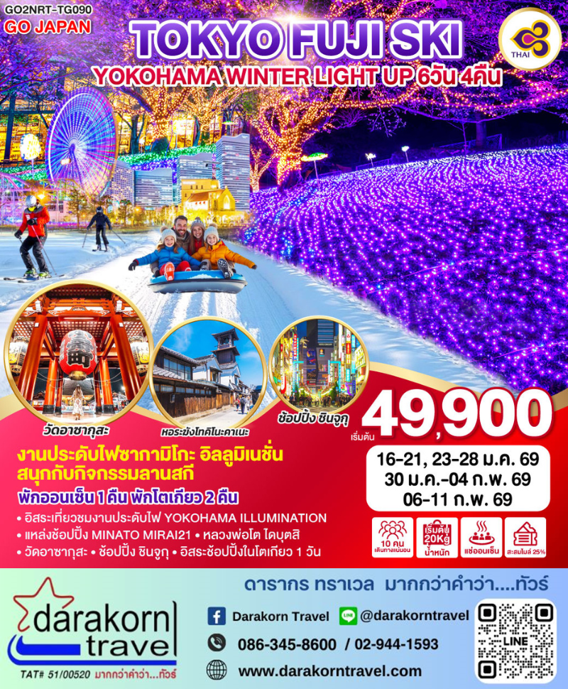 | DAY2 | โตเกียว (สนามบินนาริตะ) – เมืองคาวาโกเอะ – หอระฆังโทคิโนะคาเนะ – งานประดับไฟซากามิโกะ อิลลูมิเนชั่น – แช่น้ำแร่ธรรมชาติ – เมนูบุฟเฟต์ขาปู |