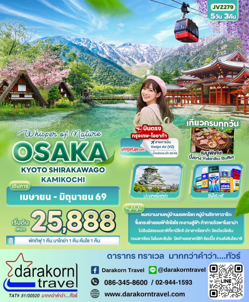 | DAY2 | ท่าอากาศยานนานาชาติสุวรรณภูมิ ประเทศไทย – ท่าอากาศยานนานาชาติคันไซ ประเทศญี่ปุ่น – โอซาก้า – ปราสาทโอซาก้า(ด้านนอก) – จังหวัดมิเอะ – กระเช้าลอยฟ้าโกไซโช – จังหวัดกิฟุ – Aeon Mall |