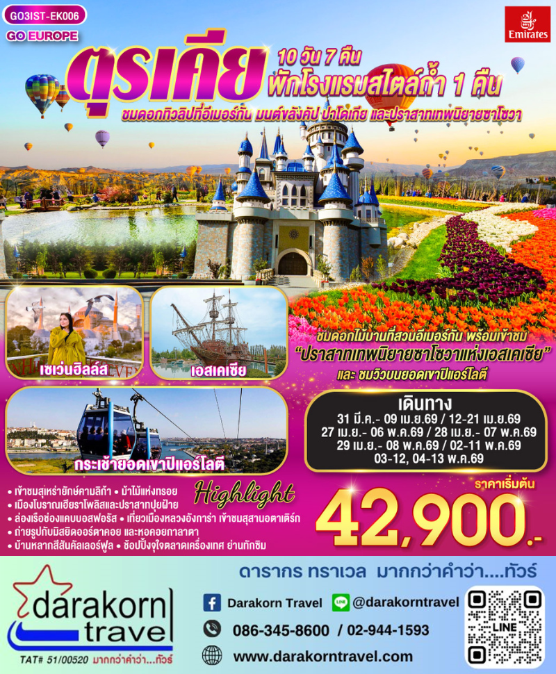 | DAY2 | สนามบินสุวรรณภูมิ – สนามบินดูไบ (สหรัฐอาหรับเอมิเรตส์) – สนามบินอิสตัลบูล (ตุรเคีย) – สวนอีเมอร์กัน |