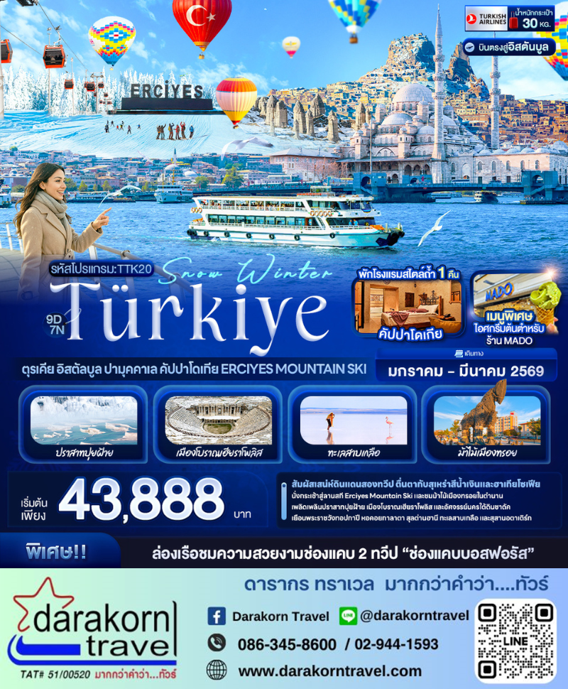 ทัวร์ตุรกี – Snow Winter Türkiye ตุรเคีย อิสตัลบูล ปามุคคาเล คัปปาโดเกีย Erciyes Mountain Ski 9วัน7คืน(TK)เดือนมกราคม – มีนาคม 2569 |