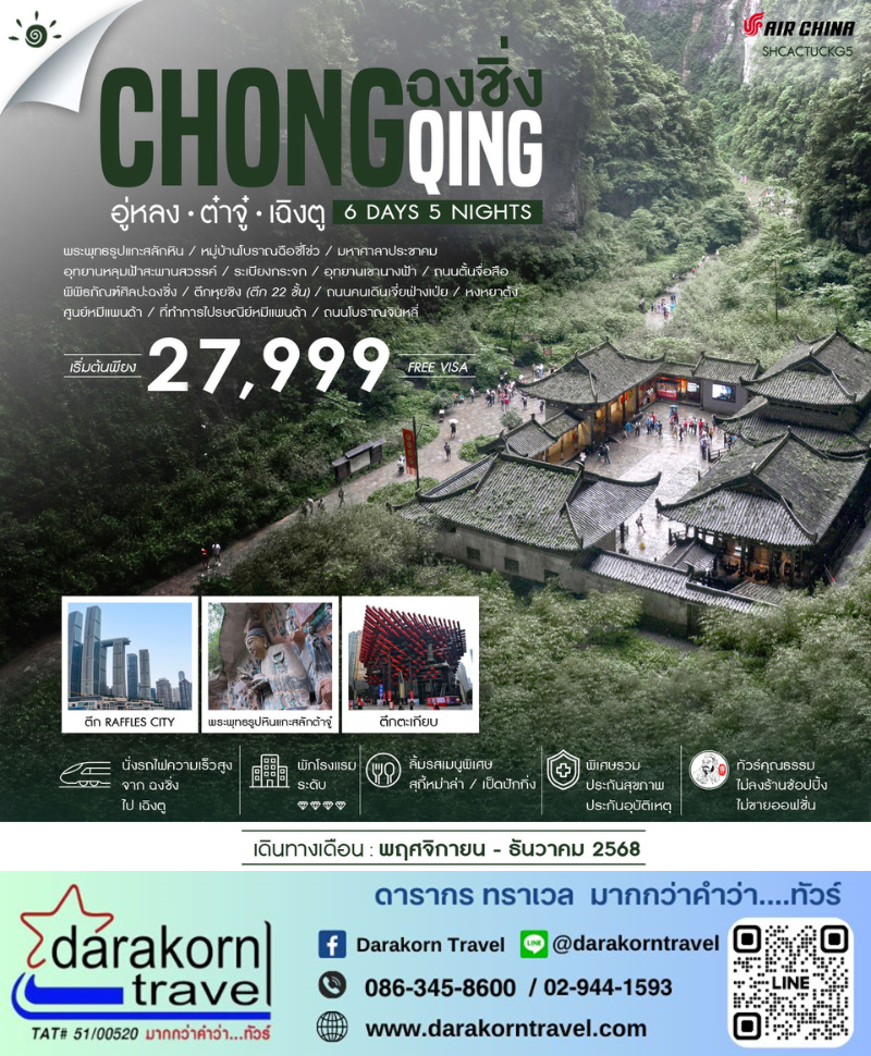 DAY2 | เฉิงตู – ต้าจู๋ – พระพุทธรูปแกะสลักหิน (รวมรถแบตเตอรี่) – ต้าจู๋ – ฉงชิ่ง – หมู่บ้านโบราณฉือ ชี่โข่ว – ชมด้านนอกมหาศาลาประชาคม – Raffles City Chongqing |