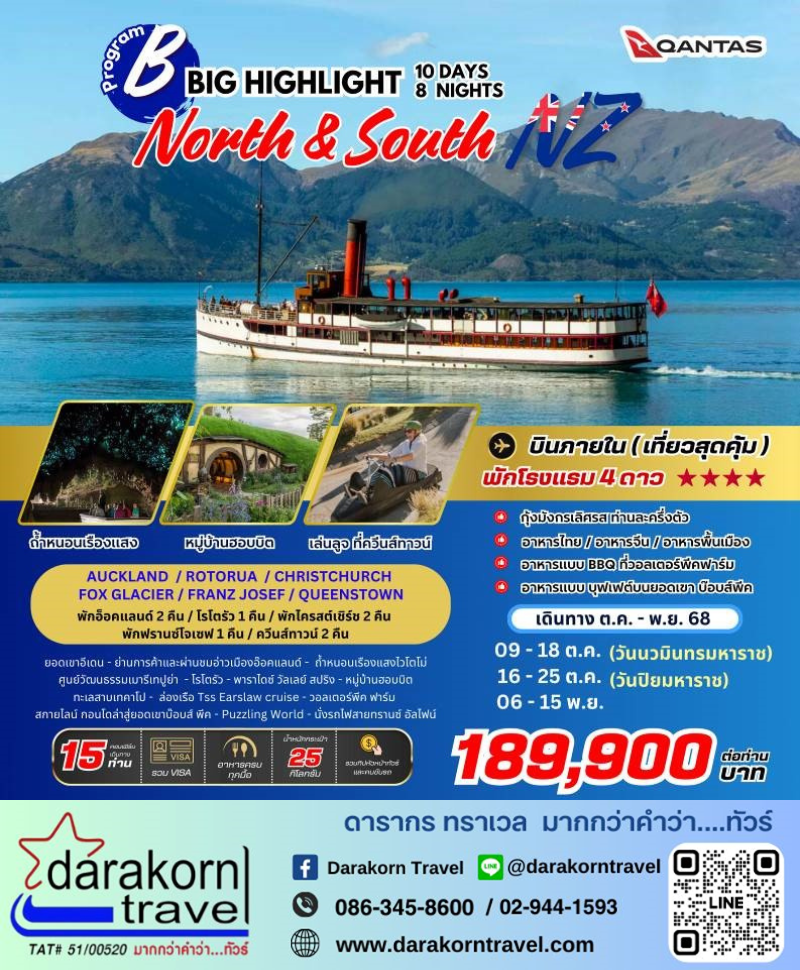ควีนสท์ทาวน์ – แอร์โรทาวน์ – Optional tour Bungy Jumping,Jet boating –ล่องเรือ Tss Earslaw cruise – วอลเตอร์พีค ฟาร์ม – สกายไลน์กอนโดล่า – ยอดเขาบ๊อบส์พีค – เล่นลูจ |