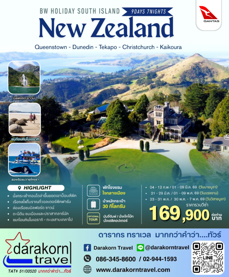 ควีนส์ทาวน์ – แอร์โร่ทาวน์ – เรือกลไฟโบราณTSS EARNSLAW – วอลเตอร์พีคฟาร์ม – กระเช้ากอนโดล่า – ยอดเขาบ๊อบส์พีค – เล่นลูจ |