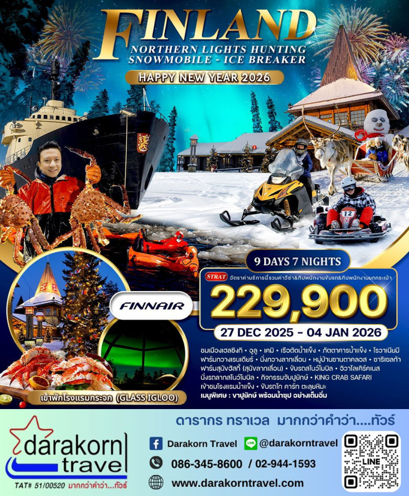 ทัวร์ฟินแลนด์ - สโนว์โมบิล ฉลองปีใหม่ 2026 พักGlass Igloo 9วัน7คืน(AY)เดือนธันวาคม 2568