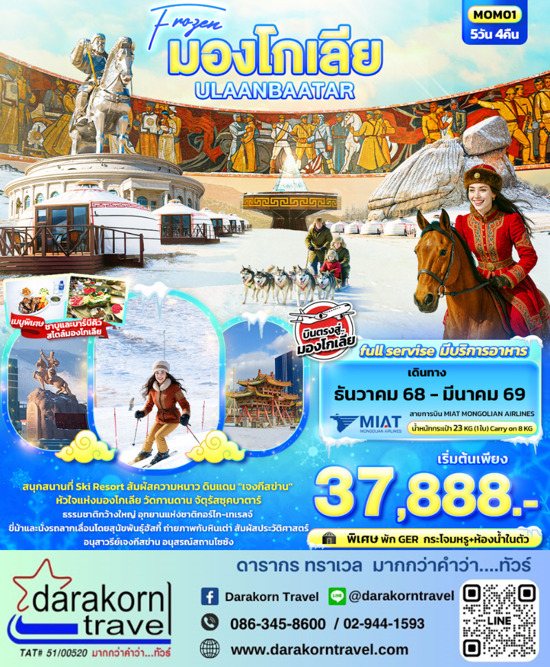 DAY4 | อนุสาวรีย์เจงกีสข่าน – เมืองอูลานบาตอร์ – อนุสรณ์สถานไซซัง – Sky Ski Resort (รวมค่าเข้า) |