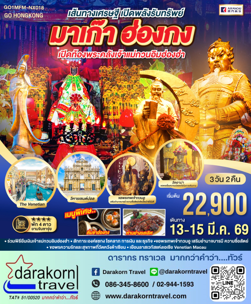 | DAY3 | มาเก๊า – วัดอาม่า – เซนาโด้สแควร์ – วัดกวนไท – วิหารเซนต์ปอล – ร้านขนมพื้นเมือง – เจ้าแม่กวนอิมริมทะเล – เวเนเชี่ยน – สนามบินนานาชาติมาเก๊า – กรุงเทพฯ (สนามบินสุวรรณภูมิ) (NX992 MFM- BKK 19:50-21:50) |