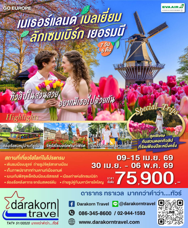 ทัวร์ยุโรป - ทิวลิปในสวนสวย อยากมีเธอไปด้วยกัน 7วัน5คืน(BR)เดือนเมษายน 2569